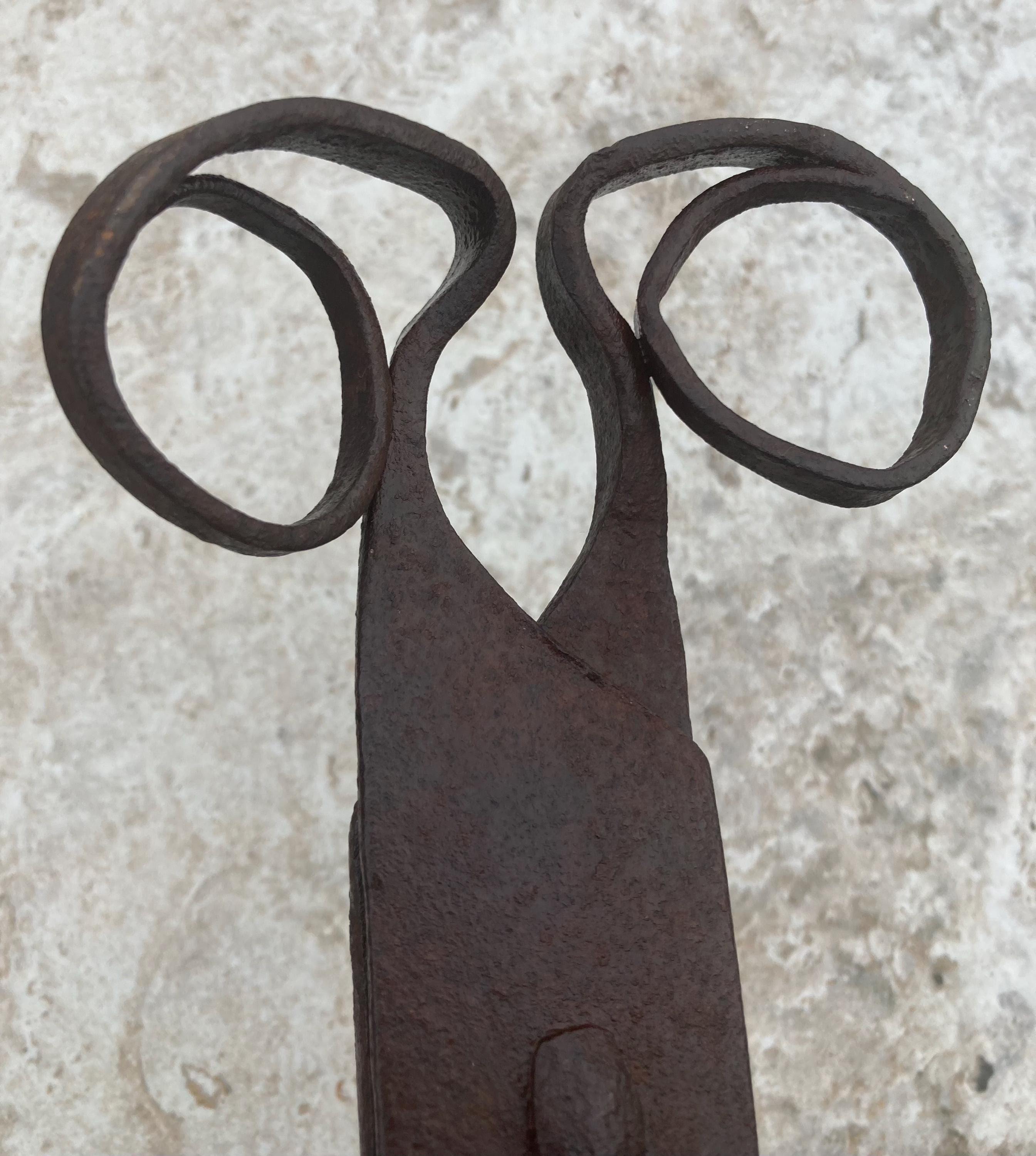 Mid-19th Century forged iron shears in good, as-found condition! These primitive scissors were crafted by a blacksmith and are still sharp and functional. Crude, ancient-looking handles with finger holes crafted of curled iron. Found among other early tools in an old barn, these wrought iron shears are well-preserved although there's some rust on the handles along with a very old patina throughout! Each side has a hallmark in the shape of a rooster stamped in the outside of both of the blades along with the manufacturer's name 'SANTIAGO J CAMPO CORONADA'. These are about 11 1/2 inches long when closed. This early, handcrafted tool is guaranteed old and authentic! Great-looking, displays nicely and well made!