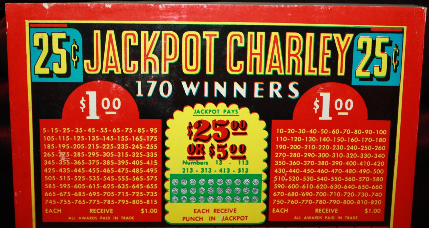 We recently discovered some unused gambling punch boards from the 1940s-1950s in very good condition. Punch boards were most commonly found in taverns and bars but also used in some stores, they were meant to serve as trade stimulators. Usually they allowed the player a chance to win some sort of product typically sold at that establishment but some places quietly paid out cash. It was even possible to win a pack of cigarettes! With this board, 25 cents bought you one punch of the little silver dots. Out of each hole came a piece of rolled up paper with a number on it. If the number matched one of the winning numbers printed at the top of the punch board, you won! If the number matched one of the 6 winning numbers in the Jackpot section, a bigger prize was won! These particular "Jackpot Charley" or "Texas Charley" boards each have 170 winners. They measure 9 inches long, 10 1/2 inches high, and 7/8 inch thick. All of the punches on these are intact and have not been used. Even the original metal punch tool is still sealed in place on the back of each. They have bright, vivid colors and are free of fading, Only some minor signs of age. $25 each.