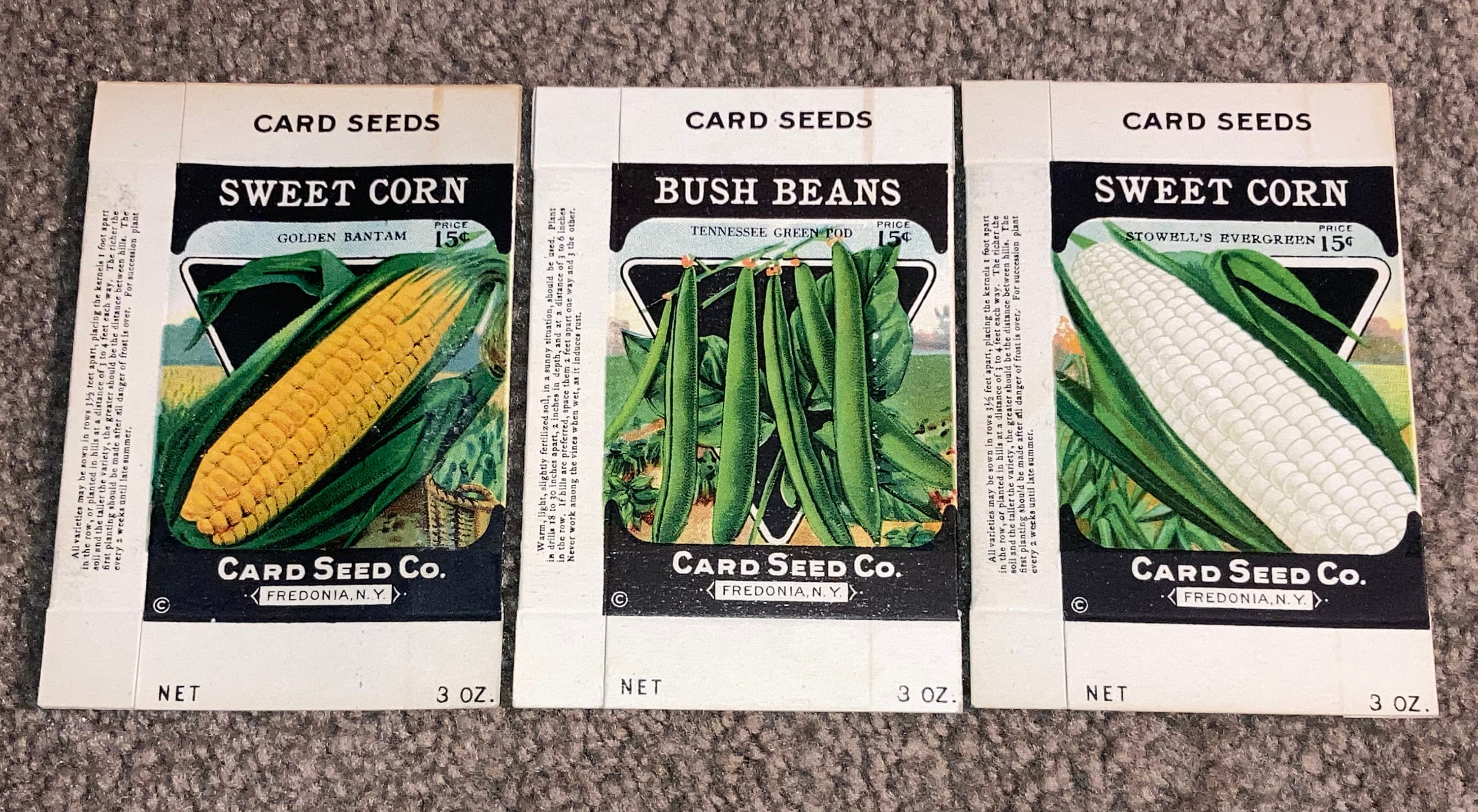 Here's an assortment of three vintage vegetable seed boxes in never-used condition. They date back to the 1920s and came from the Card Seed Co. of Fredonia, N.Y. These boxes were part of a warehouse find and were discovered as preparations were being made to demolish the old building. They were printed by the Genesee Valley Lithograph Co. of Rochester, N.Y. Each has beautiful, detailed, colorful graphics that are still vivid without any fading. They are made of stiff cardstock which is well preserved; only minor ageing on the white portions is present. These unassembled boxes include: Golden Bantam Sweet Corn, Stowell's Evergreen Sweet Corn, & Tennessee Green Pod Bush Beans. These old boxes look great framed and matted or fully assembled and displayed on a shelf among other vintage garden items, old store stock, advertising and packaging. Very scarce, only a few sets available!