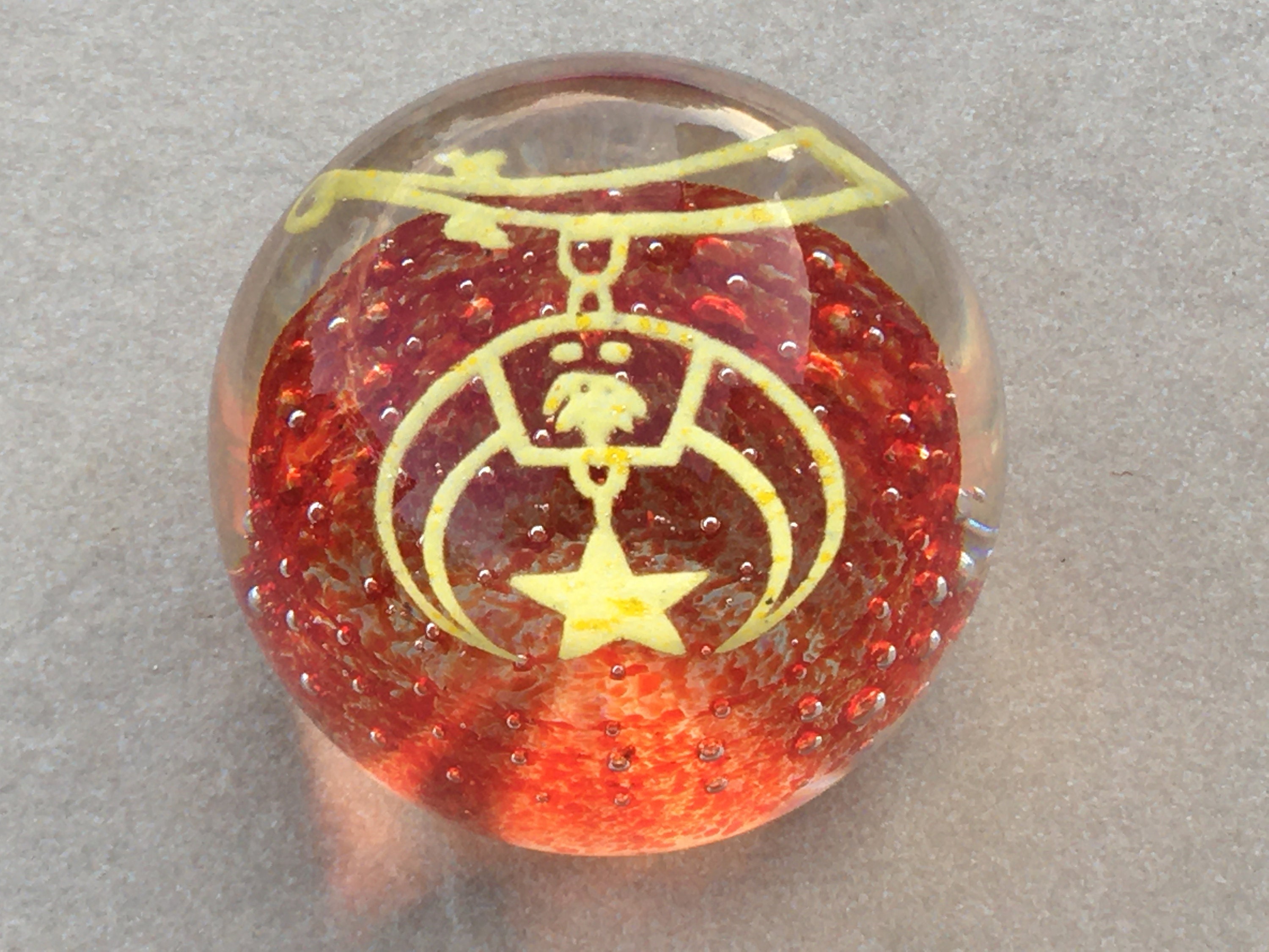 Antique glass Shriners commemorative membership paperweight in very good condition. Yellow Shriners insignia suspended in glass over a red bed of bubbles. Measures 3 inches wide and 2 1/2 inches high. No cracks or chips. Authenticity guaranteed.