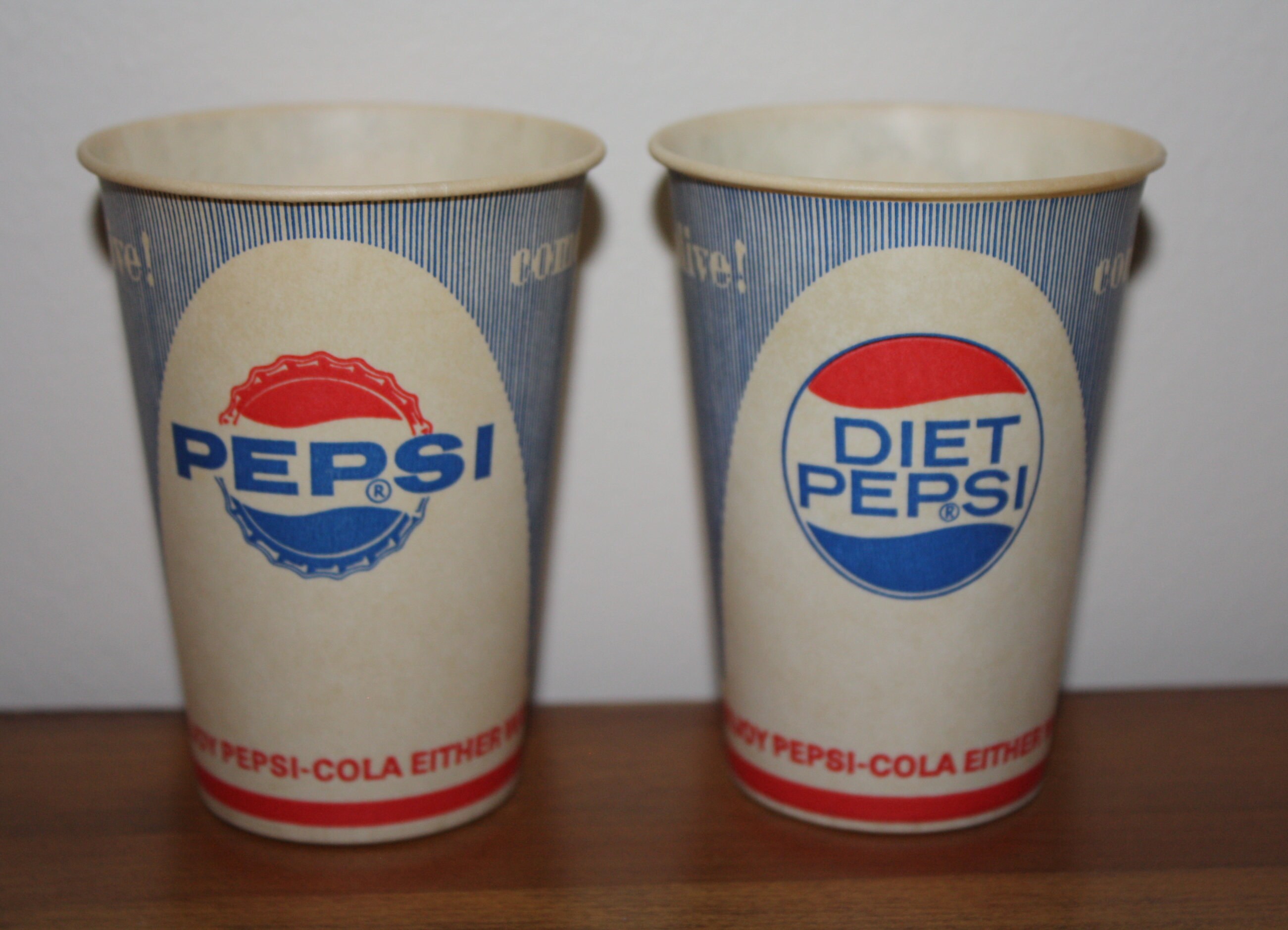 2 vintage 3 5/8" tall waxed Pepsi Cola cups in never used condition. We found an unopened box that had been stored away for decades! Each has the old slogans: "Enjoy Pepsi-Cola Either Way" and "Come Alive!" The cups have a regular Pepsi bottlecap logo on one side and a Diet Pepsi logo on the other (both sides pictured). These are original paper vending cups that are not often seen anymore. You get two for $5.00. Postage stays the same no matter how many lots you buy.